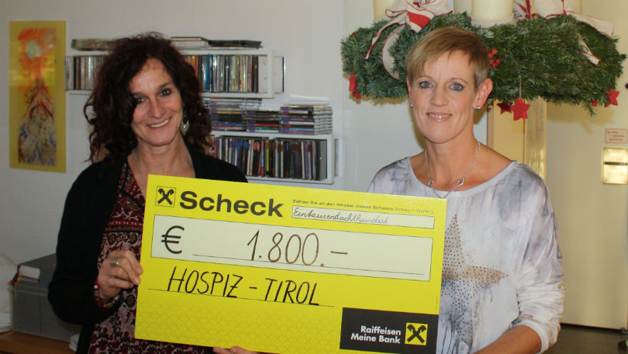Elisabeth Draxl (Pflegedienstleiterin der Tiroler Hospiz-Gemeinschaft) und Sonja Dag freuen sich über die großzügige Unterstützung für schwerkranke Menschen und ihre Angehörigen. Sonja Dag spendet den Reinerlös ihres Verkaufstandes in der Cyta in der Höhe von 1.800 Euro der Tiroler Hospiz-Gemeinschaft. Wir bedanken uns bei ihr für diese tolle Initiative, bei der Cyta für die kostenlose Verkaufsfläche und bei allen die ihren Verkaufstand besucht haben.