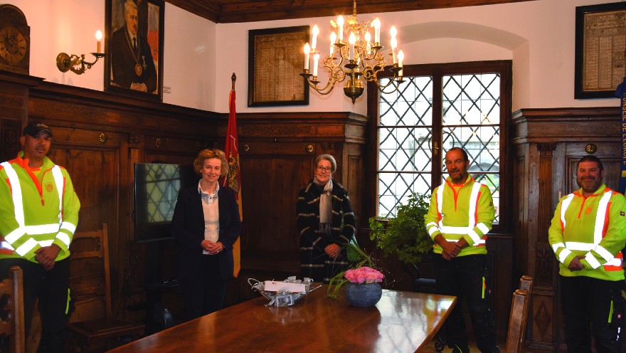 Frau Bürgermeistern Dr. Eva Maria Posch und Vereinsvorsitzende Marina Baldauf freuen sich gemeinsam mit den Mitarbeitern des städtischen Bauhofs über die Unterstützung für die Tiroler Hospiz-Gemeinschaft.