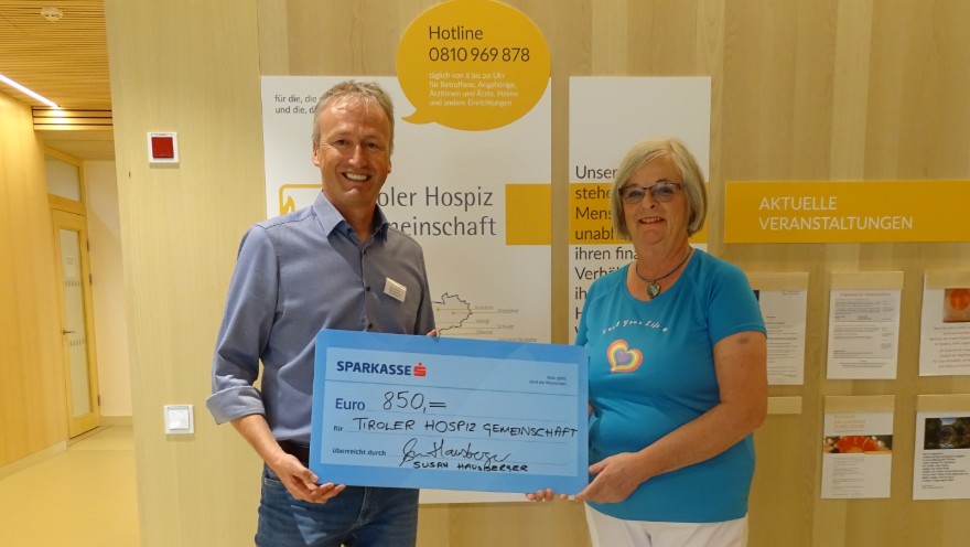 Werner Mühlböck (Geschäftsführer) und Susan Hausberger freuen sich über die großzügige Unterstützung der Hospizarbeit.