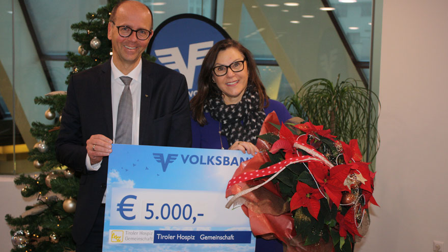 Mag. Martin Holzer, Vorstand der Volksbank Tirol AG, übergibt den Scheck an Frau Dr. Elisabeth Zanon (Vorsitzende der Tiroler Hospiz-Gemeinschaft).
