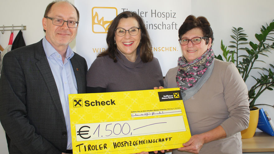 Wolfgang Ullmann (Geschäftsführer Wirtschaftsbund Innsbruck-Stadt), Vorsitzende der Tiroler Hospiz-Gemeinschaft Elisabeth Zanon und Ortsobfrau Loni Appler, freuen sich über die großzügige Unterstützung der Hospizarbeit. Im Rahmen des Adventmarkts in Arzl, am 8. Dezember 2016, wurden innerhalb von fünf Stunden 1.500 Euro für schwer kranke Menschen und ihre Angehörigen gesammelt. Vielen Dank für diese so wichtige Hilfe!