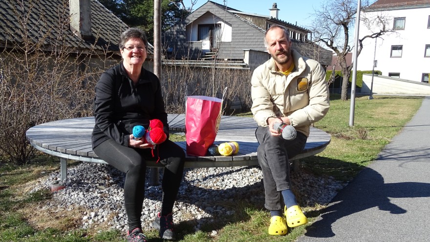 Frau Egger und Piet Wolters (Leiter Tageshospiz) freuen sich über die Wolle fürs Tageshospiz.